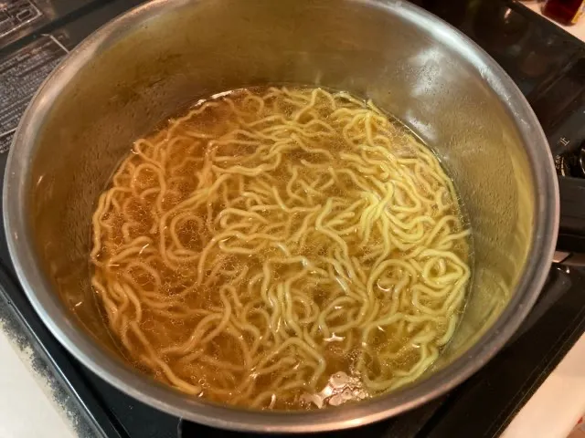 ステップ3:めんが茹で上がったら火を止めてスープを入れる
